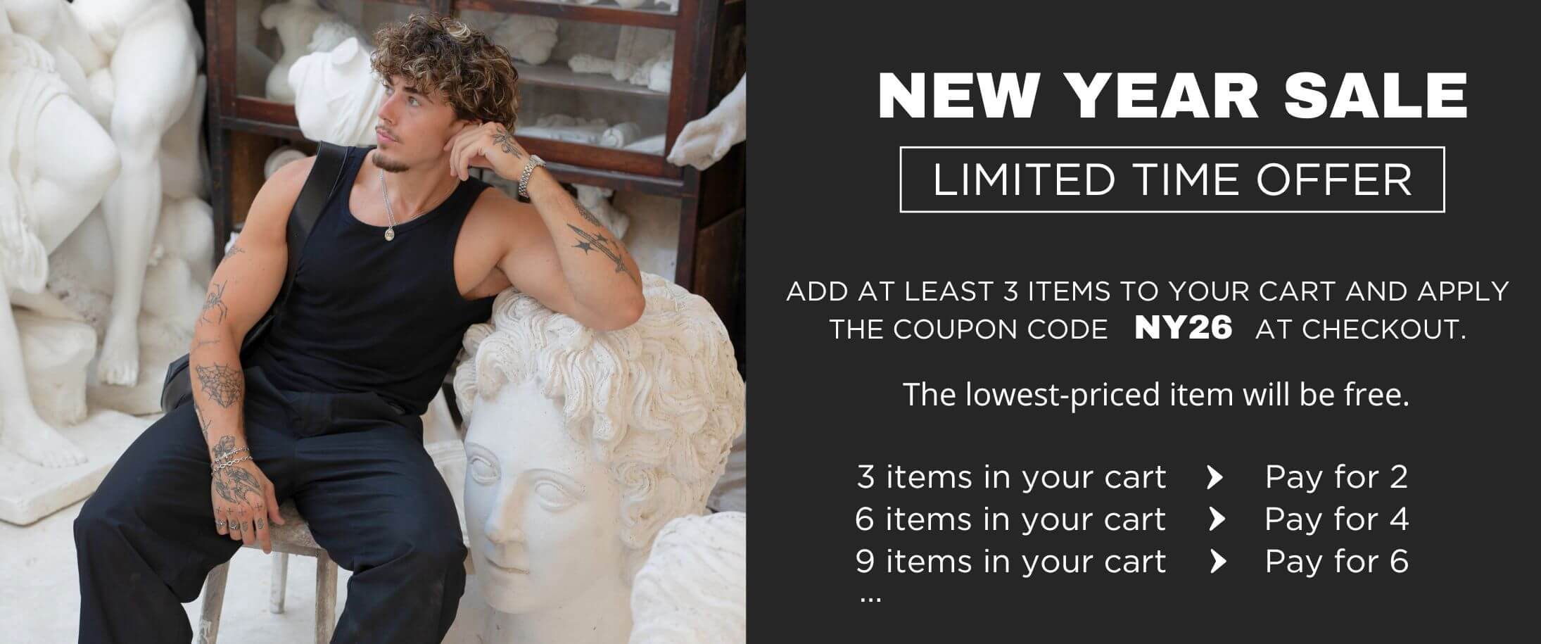Add 3 jewelry pieces to your cart and apply the coupon code “NY26” at checkout, you’ll automatically get 1 of them for free (the lowest-priced item).